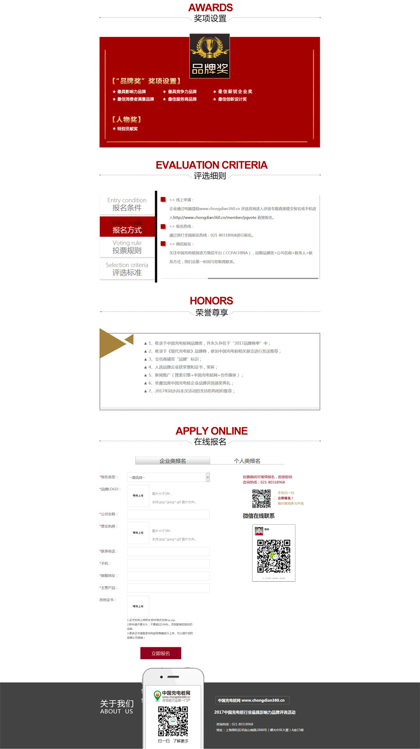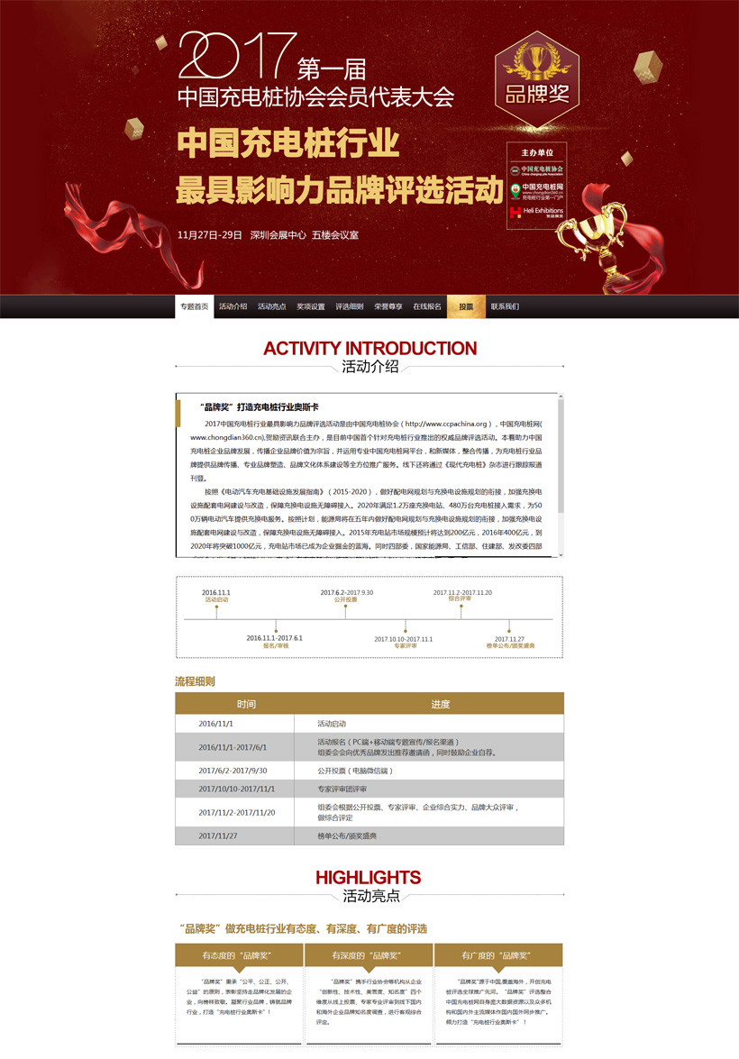中國充電樁網是國內首家充電樁行業門戶,此次開發投票系統,用于行業評選,訪問者可在線申請,上傳附件,證件等一系列資料,后臺可查看信息,通過后可參與評選,整體風格美觀大方,功能齊全!